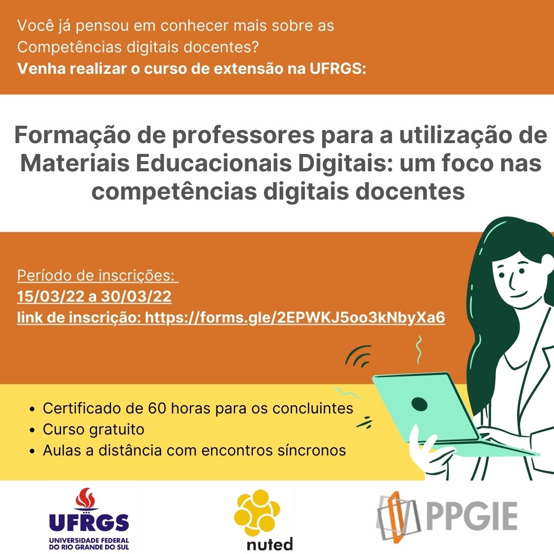 Estamos com inscrições abertas para o curso de extensão “Formação de professores para a utilização de Materiais Educacionais Digitais: um foco nas competências digitais docentes”.