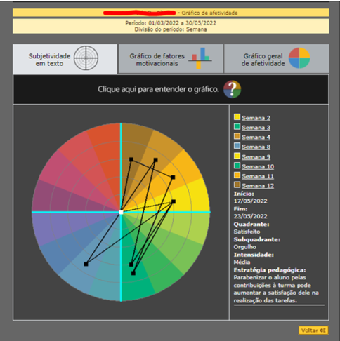 O Mapa Afetivo [1] gera gráficos para o professor com informações sobre o estado de ânimo de cada aluno ao interagir no AVA ROODA (Figura 1). A ferramenta implementa a Roda dos Estados Afetivos (Figura 2) dividida em quatro quadrantes que representam os estados de ânimo positivos, definidos por ser/estar satisfeito e animado e os negativos por ser/estar insatisfeito e desanimado.